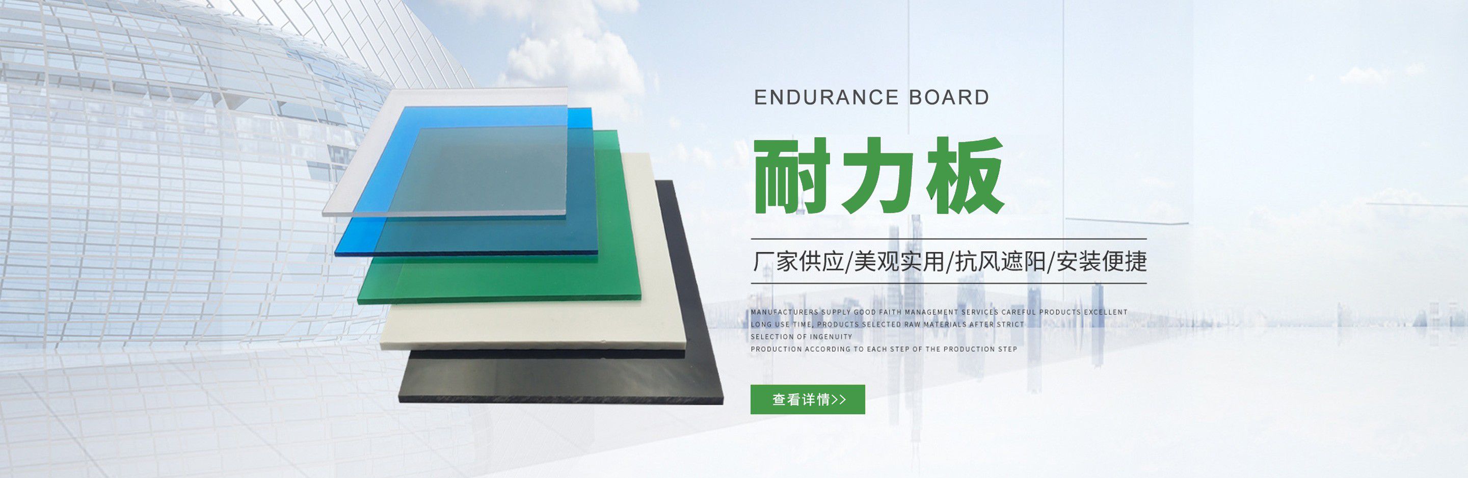 聊城市沐金塑膠有限公司注冊資金2180萬元,占地20000余平方,擁有自建廠房15000平方,員工100余名。10余年來,公司主營耐力板,鎖扣耐力板,耐力板深加工,無動力通風器,組合雨搭,PVC硬脂板,耐力板廠家等板材的發展戰略,逐漸成長為綜合性企業?! 」緭碛卸鄺l板材共擠生產線,采用世界知名品牌進口原材料和先進工藝,依據完善的ISO9001質量管理體系和ISO14001環境管理體系,為產品的卓越品質提供了強有力的保證。憑借過硬的創新能力和堅實的硬件基礎,贏創已成為國內領先的熱塑性板材生產商,產品被廣泛應用于建筑業、農業、工業、廣告業、安防行業及DIY領域?! 」臼冀K致力于通過提供最優的板材應用解決方案,為客戶創造最高的價值;堅守創新、質量、靈活、服務和速度的核心價值觀;堅持“完美的產品需要完美服務的支持”的經營理念,努力實現成為世界領先的板材與解決方案供應商的夢想。 在未來,公司將立足客戶需求,不斷改變和完善現有產品,拓展產品線和充分開發板材的應用領域,為客戶創造全方位的價值。同時更好地實現員工的價值,實現公司團隊的價值。我們將與您一起創贏未來! 企業使命:成為世界領先的板材與解決方案供應商?! 」驹妇埃和ㄟ^提供最優的板材應用解決方案,為客戶創造最高的價值。 核心價值觀:質量...